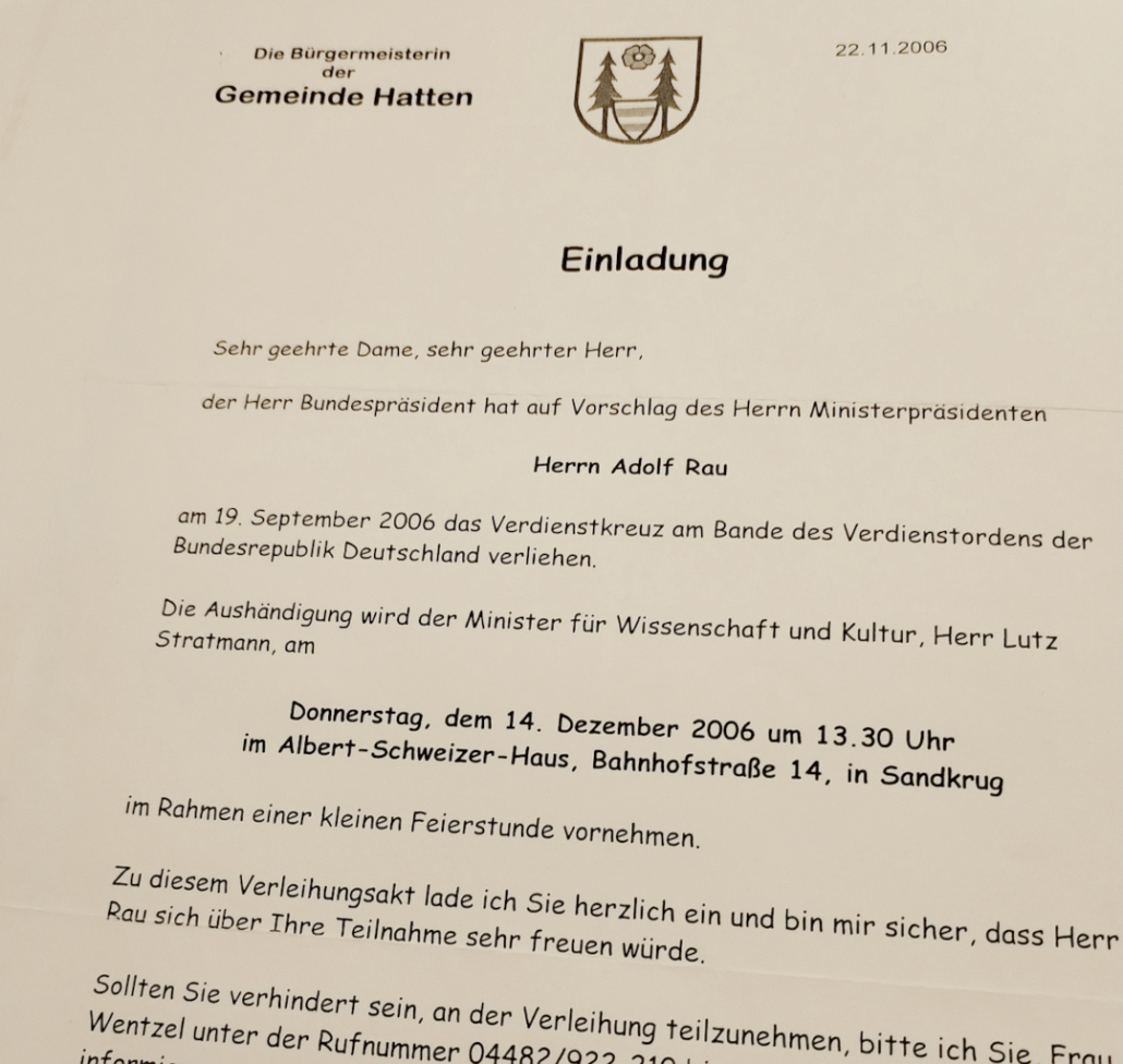 Für sein besonderes Engagement wurde Adolf Rau mehrfach ausgezeichnet. Ein Höhepunkt war am 12. Januar 1999 der Besuch bei Bundespräsident Roman Herzog und seiner Frau im Schloss Bellevue zum Neujahrsempfang. Am 19. September 2006 wurde Herrn Adolf Rau die wohl höchste Auszeichnung Deutschlands für ehrenamtlich Tätige, das Verdienstkreuz am Bande verliehen.